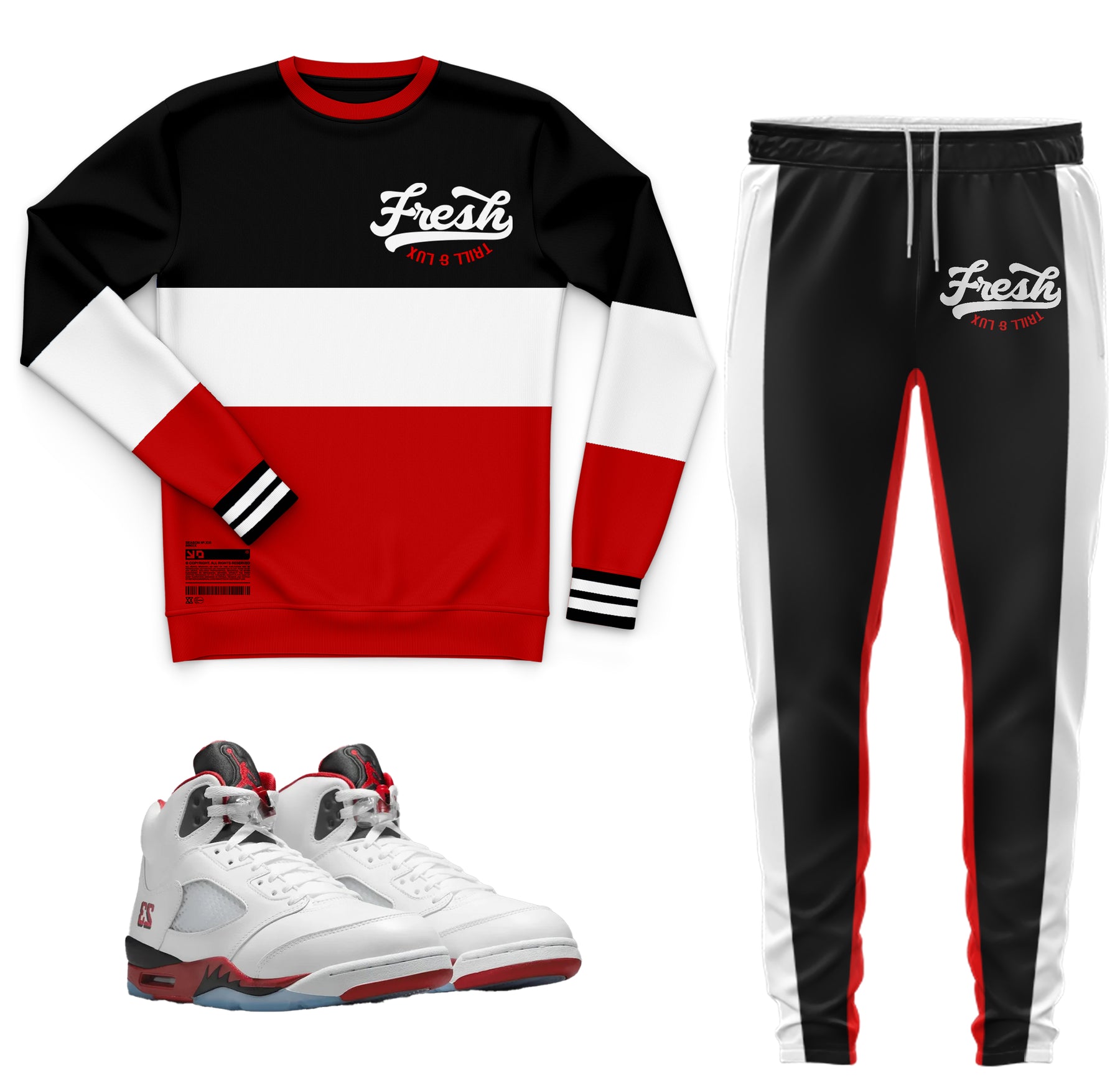 Complete your sneakerhead look with the Trill & Lux matching sweatshirt and jogger set. Designed to perfectly complement your Jordans 5 fire red black tongue, Dunks, Yeezys, Travis Scotts, and more, this outfit includes a premium French Terry crewneck sweatshirt (7.6 oz, 100% polyester) and lightweight polyester joggers. Experience ultimate comfort and style with this must-have streetwear essential. Joggers run big. Available as a set or separately.